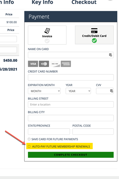 The picture below is an example of how to add auto-payment when paying membership dues.